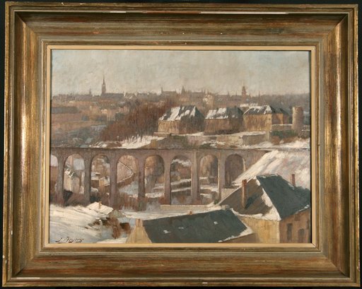 Der Malstil dieses Werks von Josy Meyers ist realistisch mit impressionistischen Einflüssen. Die Komposition zeigt eine detailreiche, stimmungsvolle Darstellung der winterlichen Stadtlandschaft Luxemburgs.