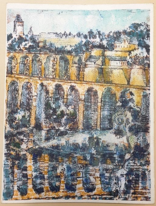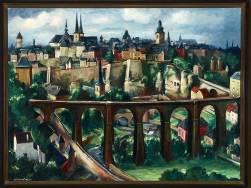 The viaduct is clearly the focal point of the composition in display. The warm, earthy tones of the architecture contrast with the lush green of the vegetation and the dramatic cloudy sky. The scene conveys atmospheric depth and reflects the charm of the Luxembourg capital.