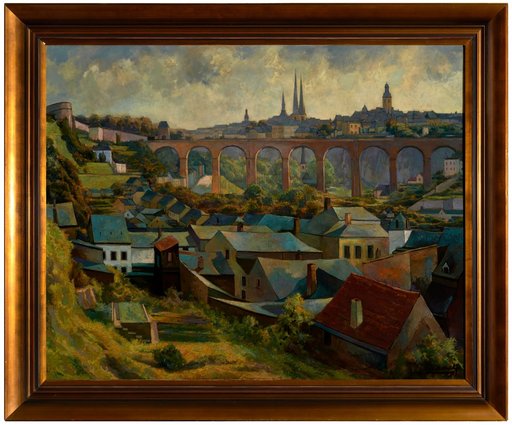Das Viadukt steht eindeutig im Mittelpunkt der hier vorgestellten Komposition. Die warmen Erdtöne der Architektur kontrastieren mit dem satten Grün der Vegetation und dem dramatisch bewölkten Himmel. Die Szene vermittelt atmosphärische Tiefe und spiegelt den Charme der luxemburgischen Hauptstadt wider.