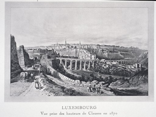 The engraving presented here is taken from a large canvas painted in 1870. By choosing this elevated viewpoint to the south-east of the city, the artist places himself in the tradition of the 16th century, particularly with the view of Braun and Hogenberg. We thus discover the different stages of urban and military development. The Clausen railway viaduct is featured, with the Pfaffenthal railway viaduct to the right, and the upper town and fortifications in the background. The openness of the city, symbolised by the viaducts, is further emphasised in the foreground, with the stonemasons engaged in the work of dismantling the fortress.