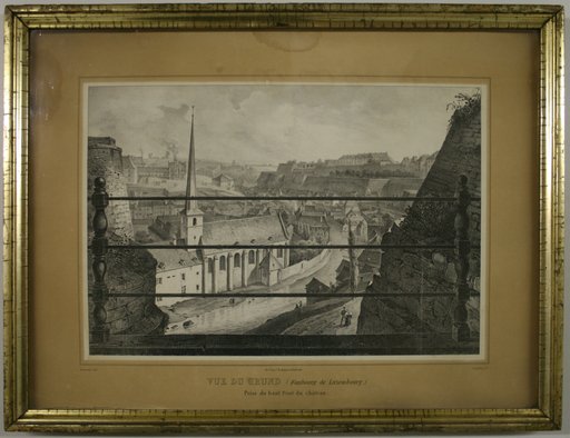 La gravure présentée ici est tirée d’une grande toile peinte en 1870. En choisissant ce point de vue surélevé au sud-est de la ville, l’artiste se place dans la tradition du 16e siècle avec notamment la vue de Braun et Hogenberg. Nous découvrons ainsi les différentes étapes du développement urbanistique et militaire. Figurent ainsi le viaduc de chemin de fer de Clausen et à droite le viaduc de chemin de fer de Pfaffenthal, à l’arrière-plan la ville haute et les fortifications. L’ouverture de la ville, symbolisée par les viaducs, est encore renforcée à l’avant-plan, avec les tailleurs de pierres qui sont engagés dans les travaux de démantèlement de la forteresse.